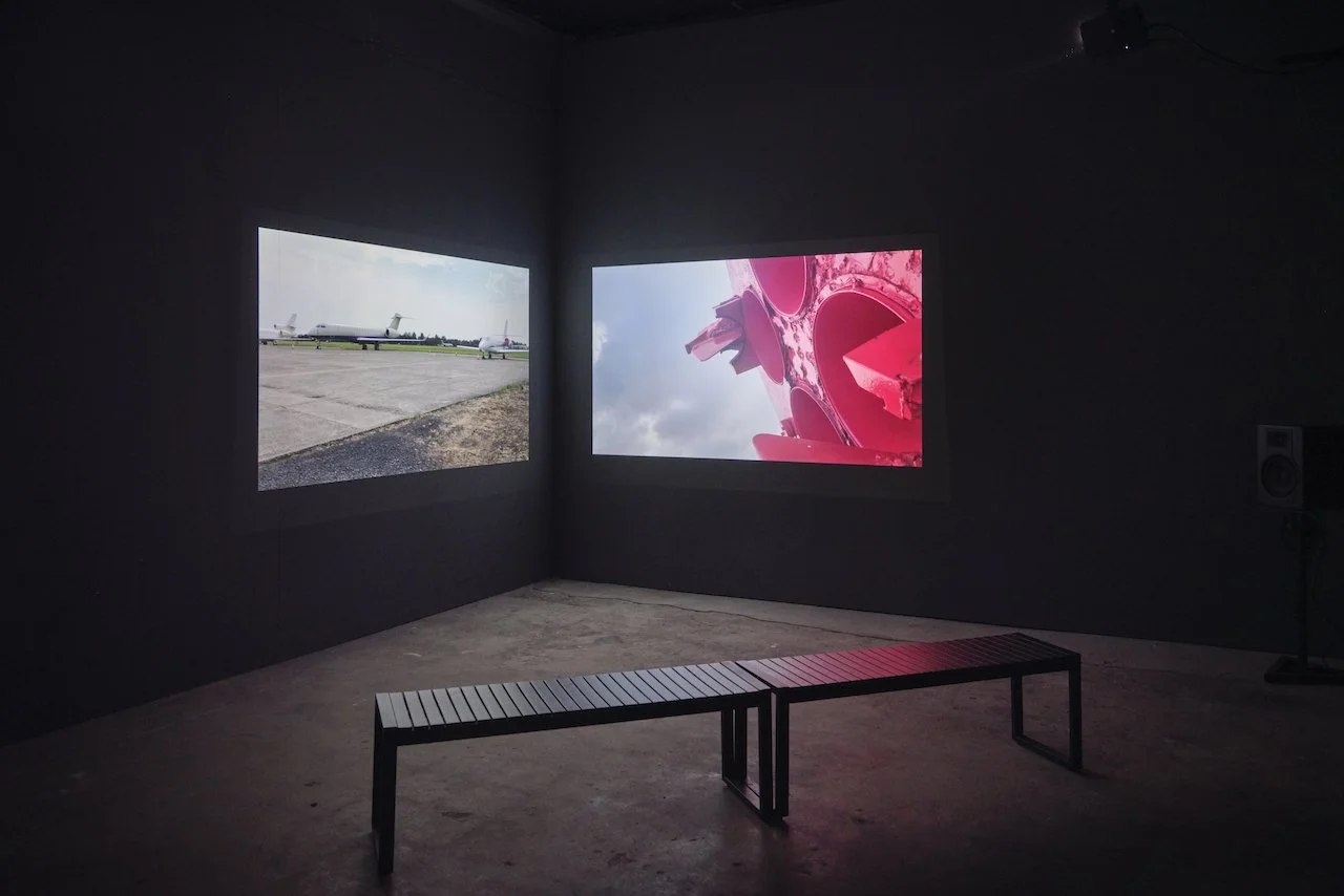 Caroline Mac Cathmhaoil, installation view of two-channel video installation Mirror States (2025), TULCA Gallery. Photo: Ros Kavanagh